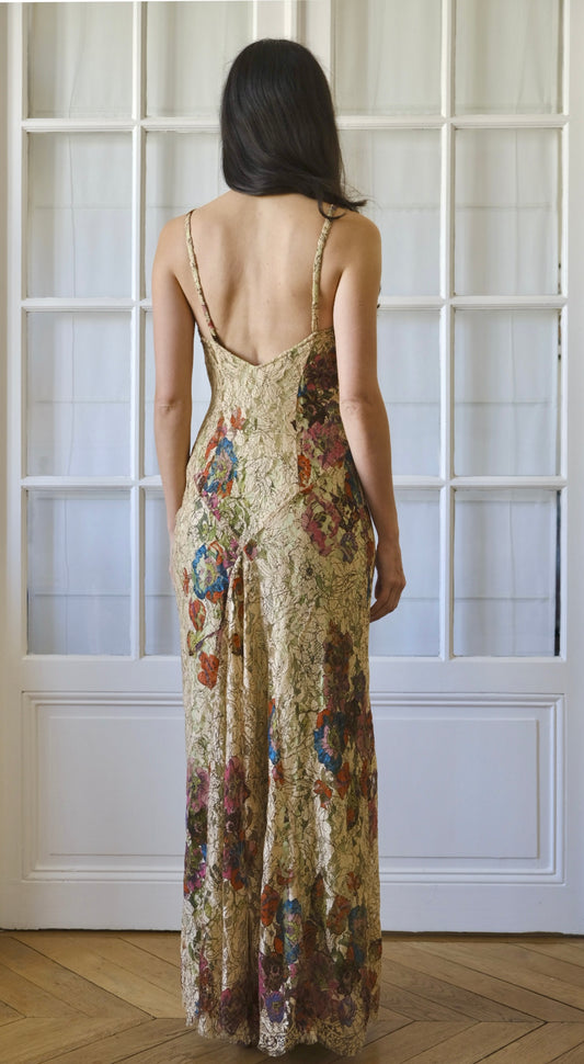 Christian Lacroix ~ Long Beige Floral Lace dress