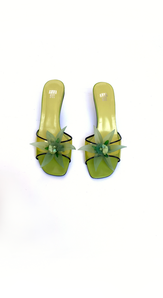 Anna Sui ~ Vintage Green Slingback Heeled Sandal with Flower