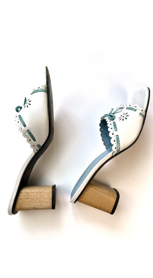 Dolce & Gabbana 1990s White & Blue Floral Eyelet Sandal Heels
