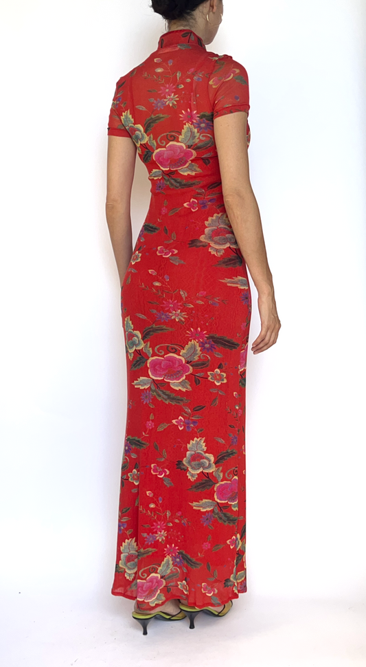 Vivienne Tam ~ 1990s Long Red Floral Mesh Cheongsam Dress