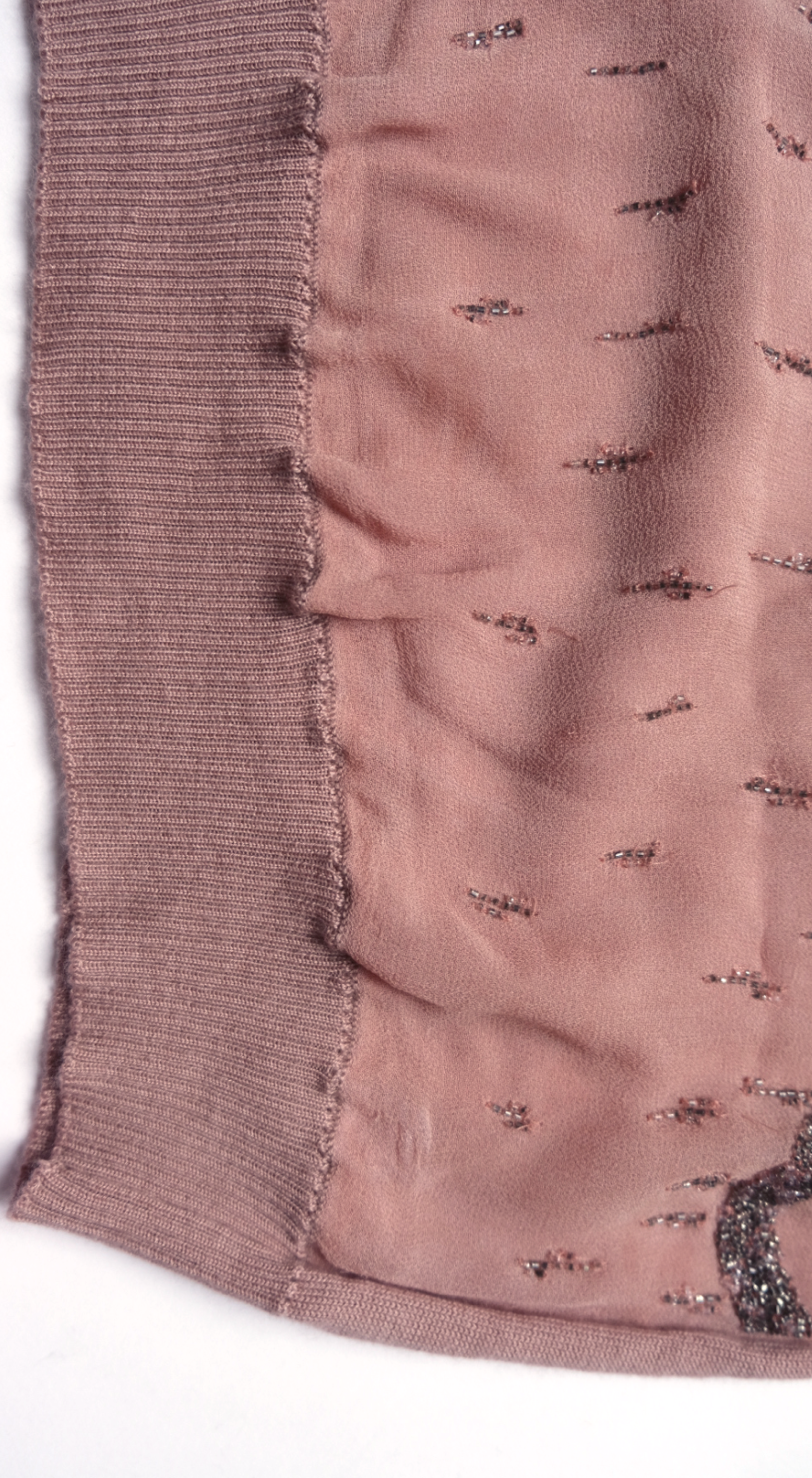 • Silk embellished panel contrasted with fine wool knit sleeves and back