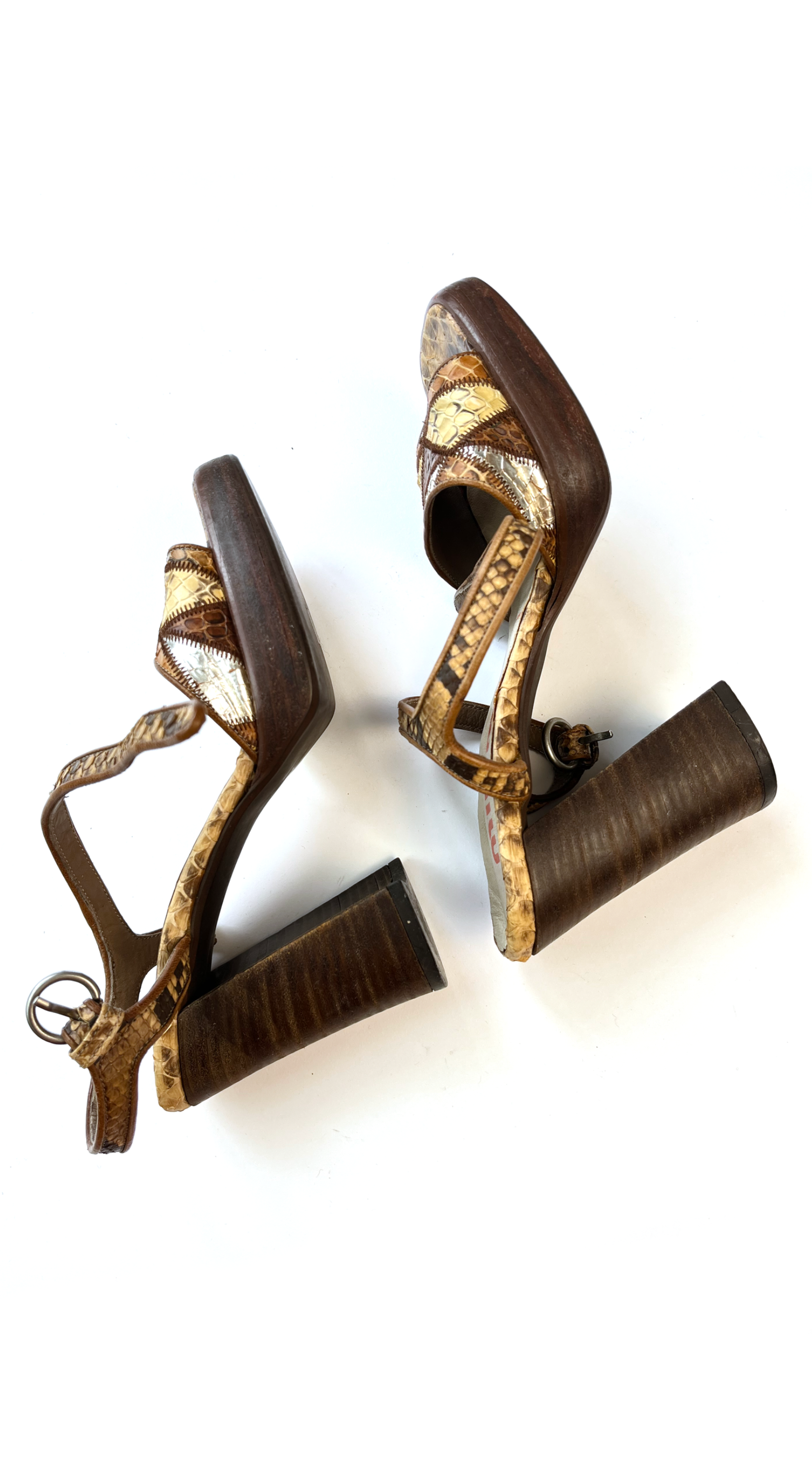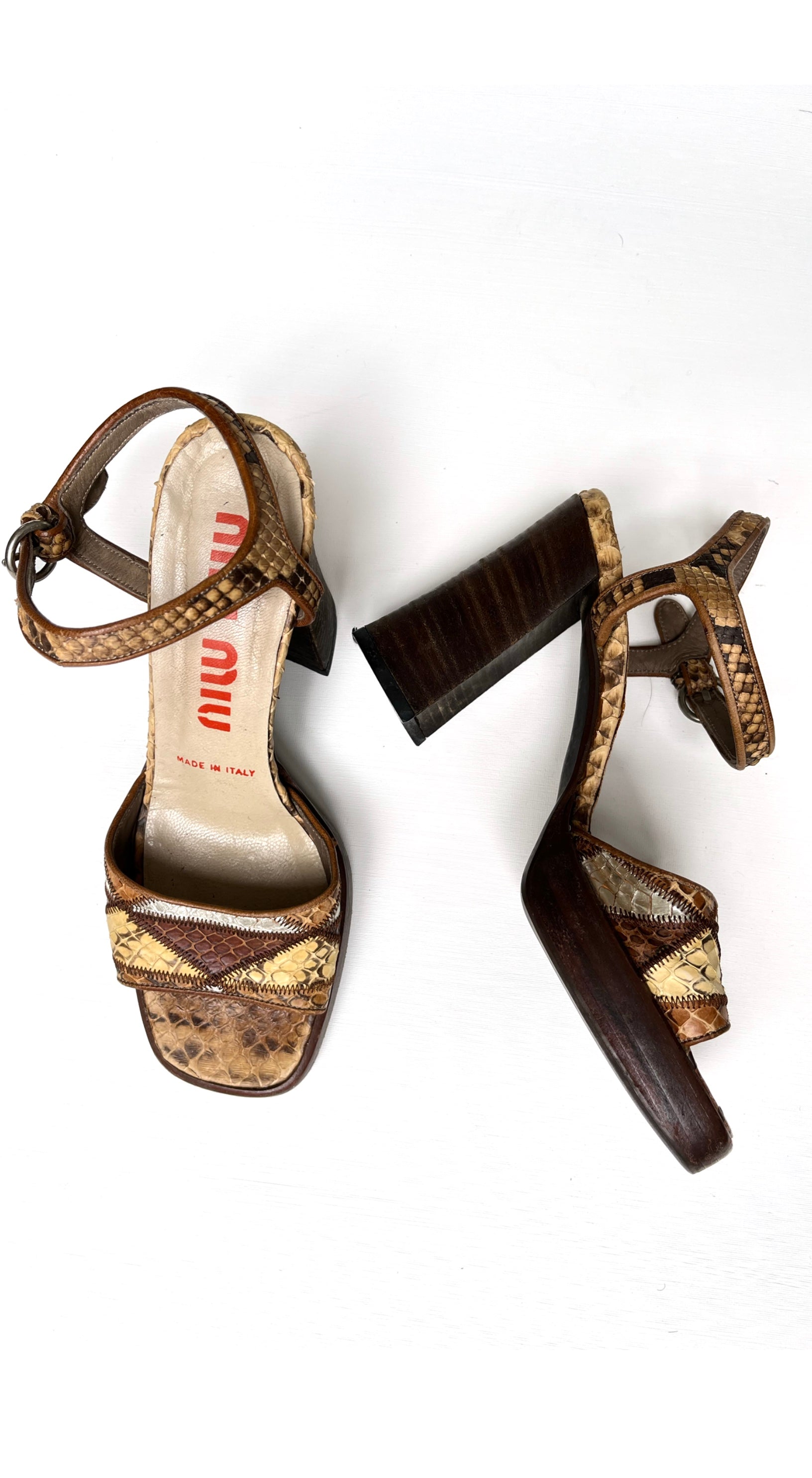 1970s-inspired Miu Miu F/W 1996 patchwork leather heels with snakeskin print in brown, beige and silver. Sturdy wooden heels with a platform make these sandals very comfortable.