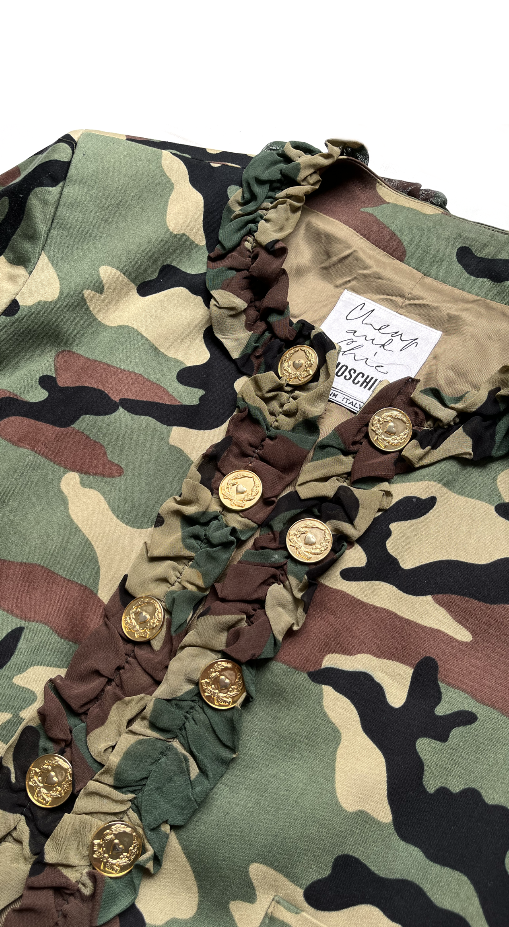 A rare Moschino Cheap & Chic camouflage set from the late 1990s capturing the playful yet bold aesthetic the house is known for. The structured jacket features signature gold logo buttons and is designed to be worn open